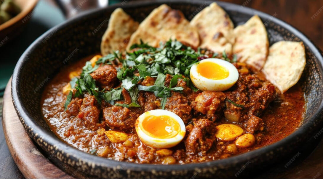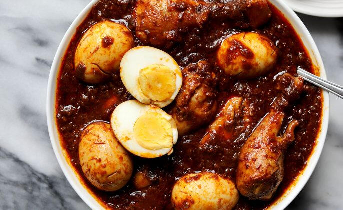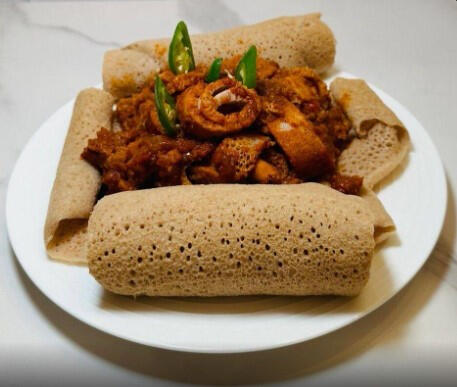 Voll Doro WotGanzes Hähnchen, 12 Eier, 10 Injera/Brot, Zwiebel, Knoblauch, äthiopische Gewürze, Butter (Gruppengericht)Allergene: A, C, G, M, N120,00 €