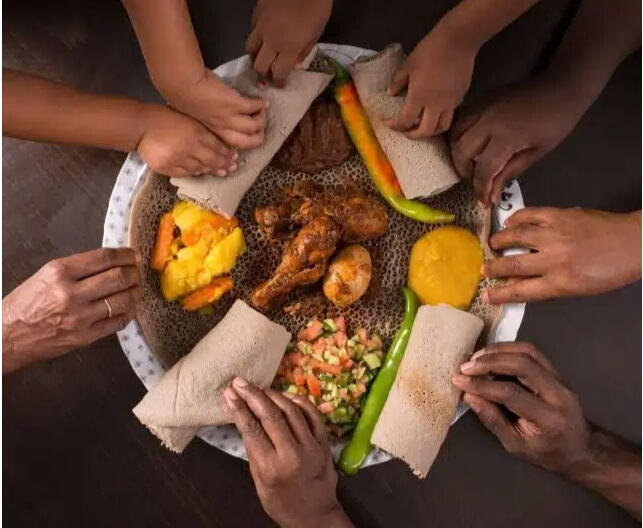 Agelgil (auf Wunsch)Wird eine Ecke der Platte nachgereicht. Rind/Geflügel 5,50 €, Vegan 5,00 €, große Ecke Veg. 8,00 €, große Ecke Fleisch 9,00 €. Gesamtpreis für 5 Personen: 45,00 €Zusätzliche Injera (pro Person)3,50 €